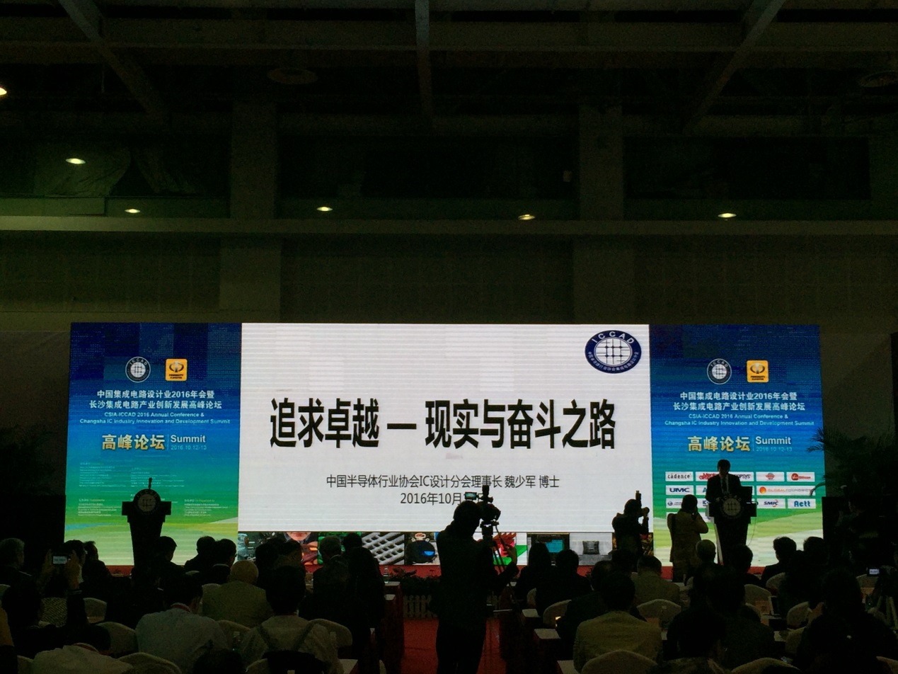 2016年10月12日至13日,中國(guó)集成電路設(shè)計(jì)業(yè)2016年會(huì)暨長(zhǎng)沙集成電路產(chǎn)業(yè)創(chuàng)新發(fā)展高峰論壇在長(zhǎng)沙召開(kāi)。本屆年會(huì)由中國(guó)半導(dǎo)體行業(yè)協(xié)會(huì)、湖南省經(jīng)濟(jì)和信息化委員會(huì)和“核高基”國(guó)家科技重大專(zhuān)項(xiàng)總體專(zhuān)家組共同主辦。湖南省副省長(zhǎng)張劍飛、工信部電子司副司長(zhǎng)彭紅兵、國(guó)家集成電路產(chǎn)業(yè)投資基金總裁丁文武、中國(guó)半導(dǎo)體行業(yè)協(xié)會(huì)副理事長(zhǎng)陳賢等領(lǐng)導(dǎo)出席會(huì)議并出致辭。來(lái)自業(yè)界的知名企業(yè)和數(shù)百名代表參加了本次年會(huì)。我公司代表也參加了本次會(huì)議。